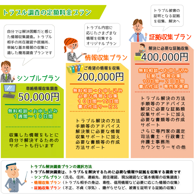 調査(情報収集)依頼のご案内 トラブル調査は、解決の為に必要な情報収集のために行うものです。必要な情報を必要な分だけ収集することで費用対効果の高い結果を得ることが可能です。自分で探偵事務所などを探し、依頼するよりも低費用での依頼が望めます。 |